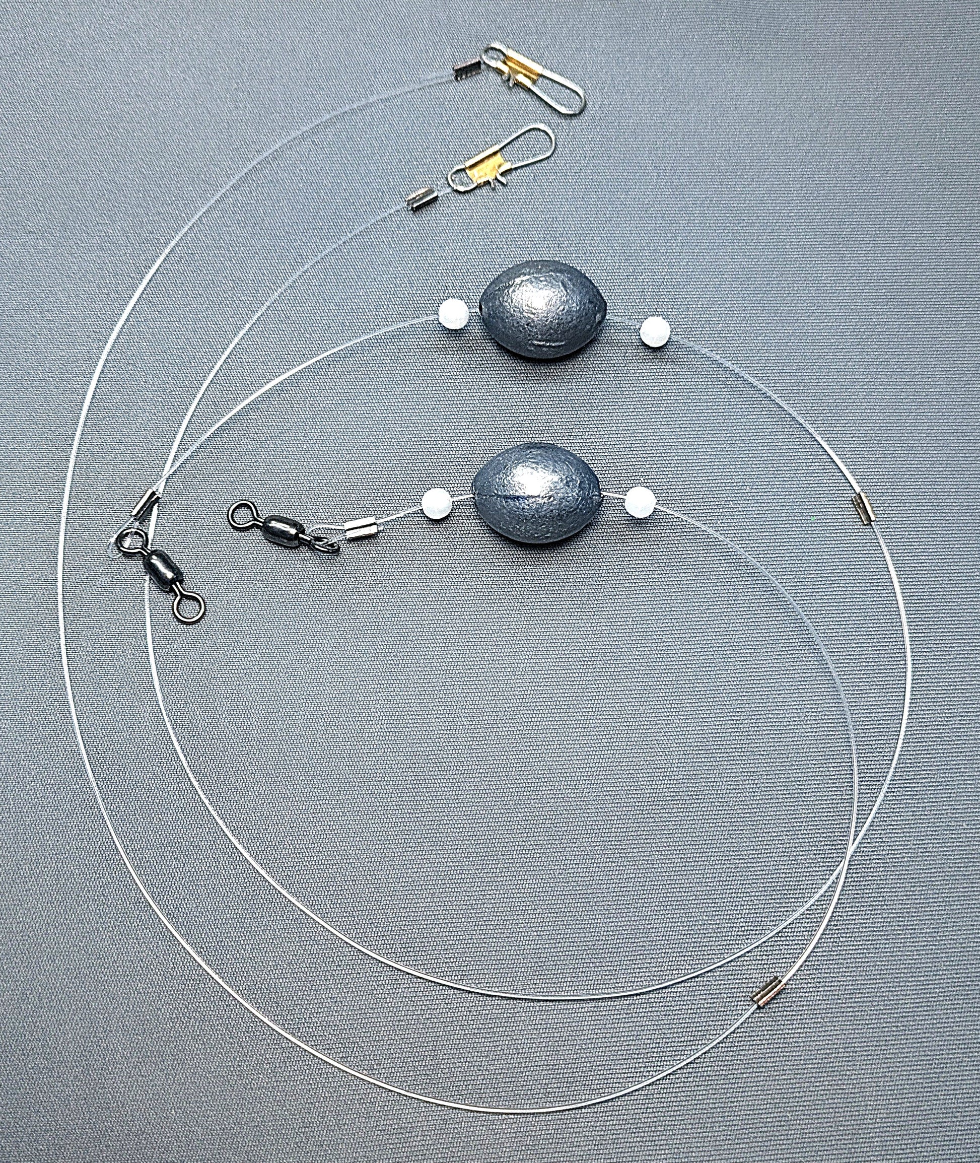 Finn's Quick Rigs are made with 24 inches of line and come already attached to a 20lb Crane Swivel and appropriate snap swivel. They in weights of 3/4oz, 1oz, 2oz, 3oz, 4oz, 6oz, and 8oz. 3/4oz-2oz comes with 50lb leader line. 3oz-8oz comes with 80lb leader line. 2 quick rigs per package.